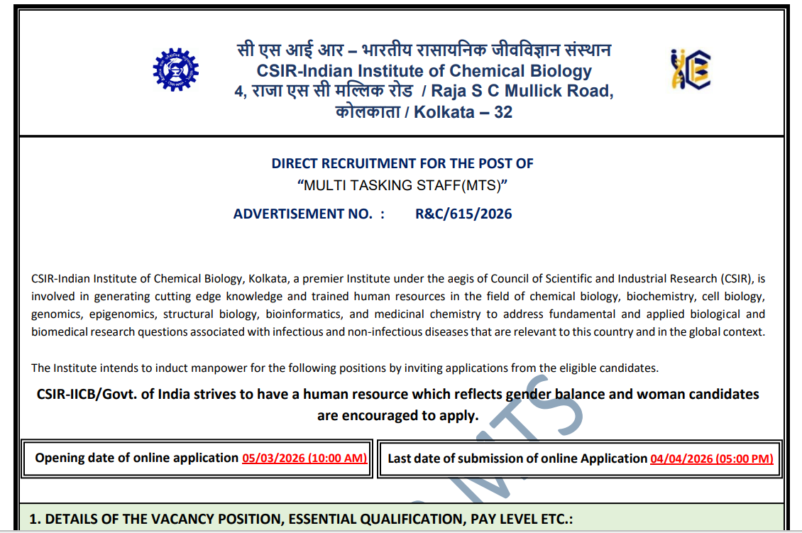 बहुत सालो के बाद यह वैकेंसी आई है लगभग 6 सालो के बाद जिसपर कोई बात नहीं कर रहा है , जो सेंट्रल गवर्नमेंट के अंदर आने वाले विभाग में नौकरी के लिए वैकंसी है जो भी विद्यार्थी दसवीं पास है उनका भी सेलेकशन हो जायेगा और इसमें ज्यादा कॉम्पिटिशन भी नहीं है और सैलरी भी अच्छा मिल जाती है चलिए जानते है कौन सा विभाग में वैकेंसी है और उसका क्या प्रोसेस है , तो बात करे तो इसका नाम – CSIR- Indian Institute of Chemical Biology है चलिए इसके बारे में भी जान लेते है। निचे फॉर्म का सारा डिटेल्स दिया गया है।